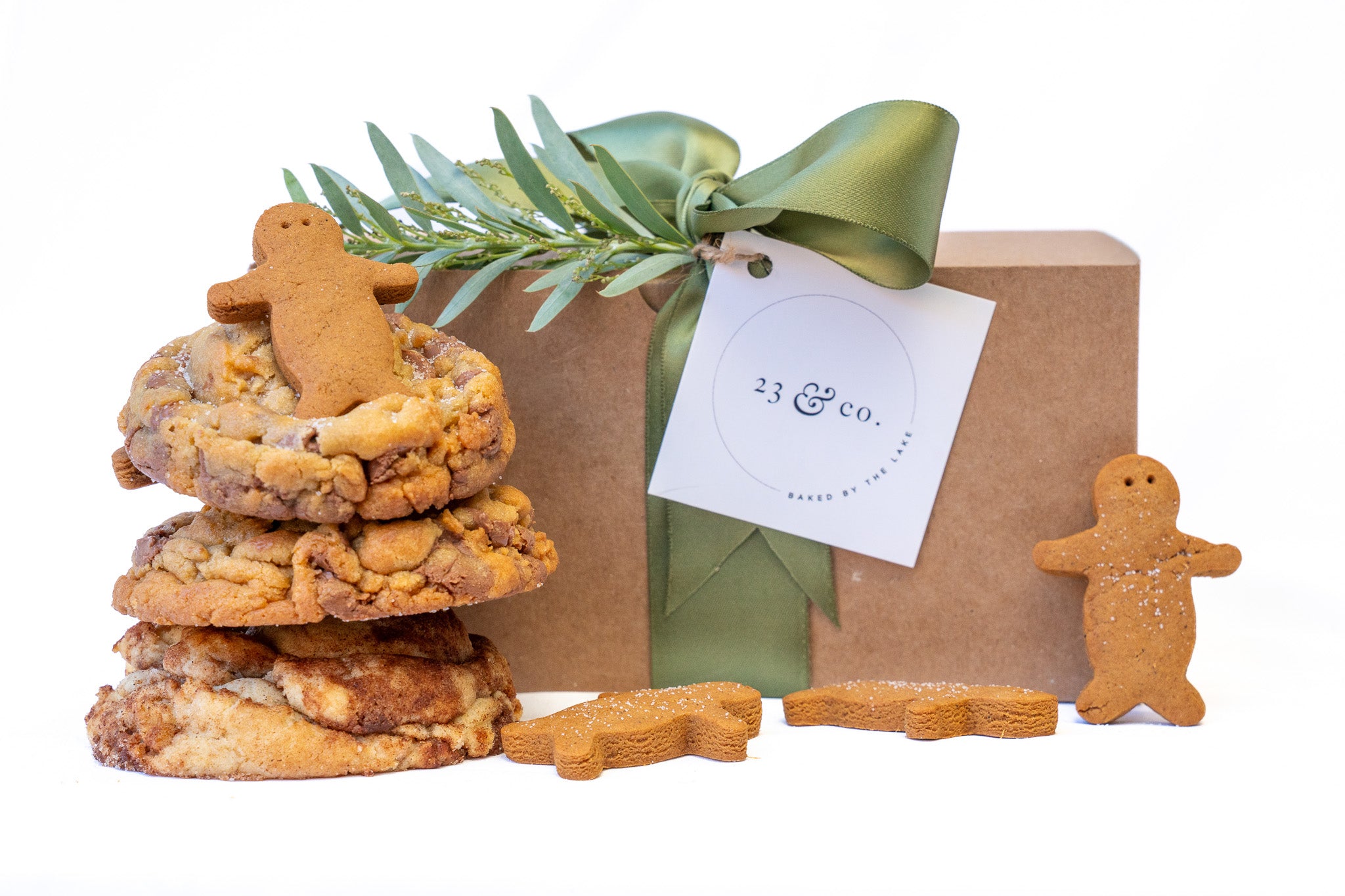 The Holiday Themed starting line up box includes six decadent holiday themed cookies; Gingerbread OG, sea salted caramel, Myrtle the turtle, the GRINCH, frosted sugar and eggnog snickerdoodle.